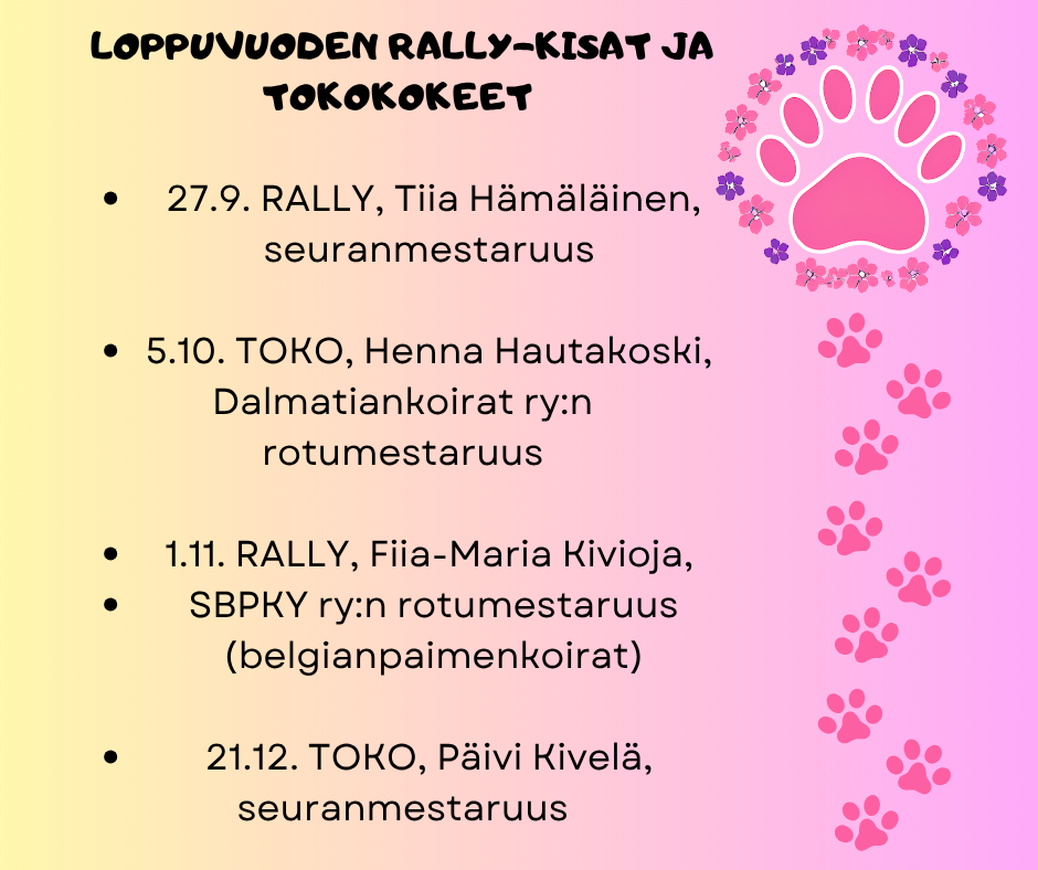 Loppuvuoden Rally-kisat ja TokokokeetKirjoittaja KAS Milla / 3.8.2025 Loppuvuoden aikana tulossa Rally-kisoja ja Tokokokeita!