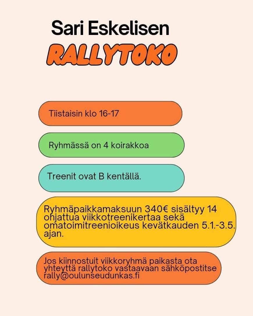 Sari Eskelisen rallytoko-ryhmä kevätkaudellaKirjoittaja KAS Milla / 18.12.2025 Tiistaisin klo 16-17 Temmeksentien hallilla.Ryhmäpaikkamaksuun sisältyy 14 ohjattua viikkotreenikertaa ja omatoimitreenioikeus kevätkauden ajan 5.1.-3.5.