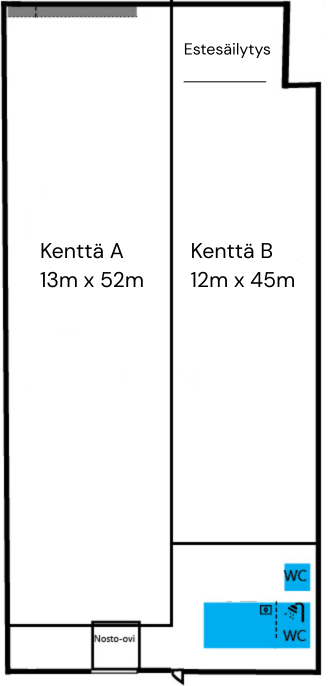 Temmeksentien halli on 1343m² (25m x 54m) kokoinen yhtenäinen tila joka on mahdollista jakaa useampiin osiin hallilla olevien kevein, siirrettävin väliseinin. Hallin valokatkaisija löytyy hallista heti oven vasemmalta puolelta.